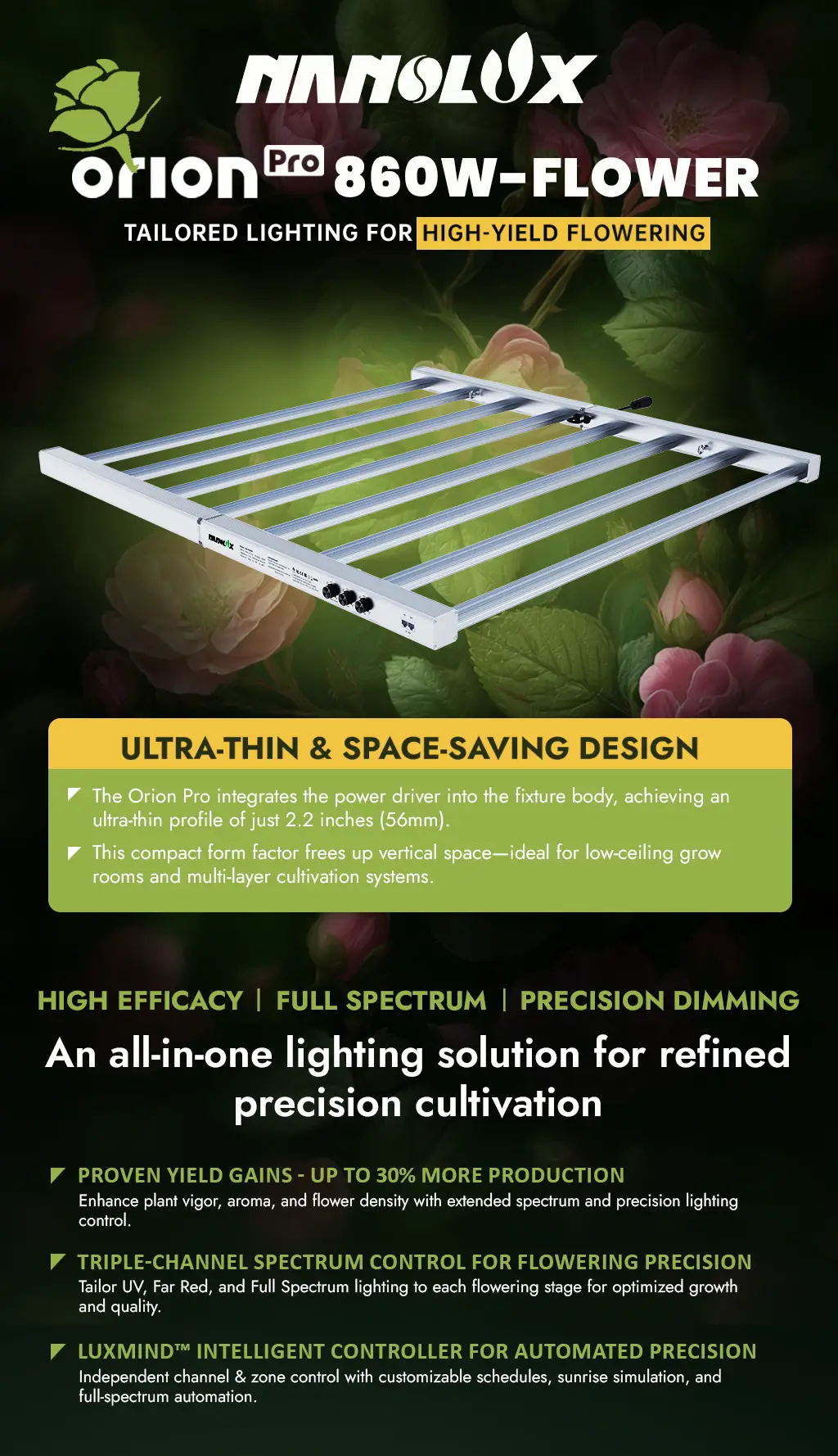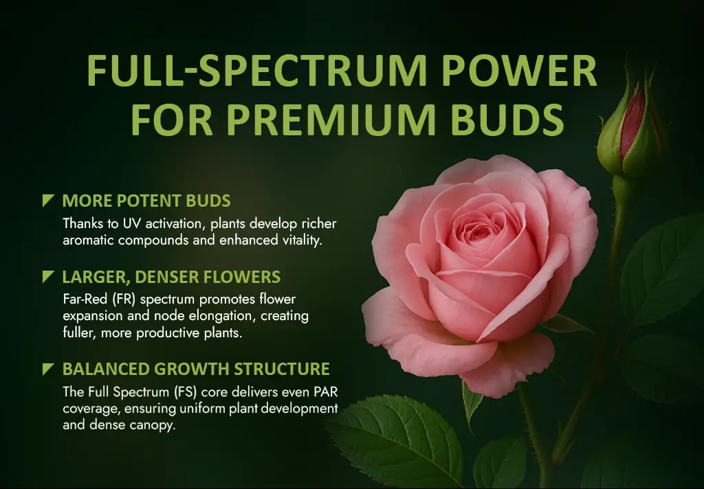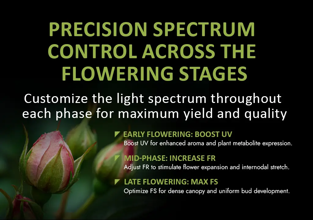 • Triple Control: Independent channels for FS, FR, and UV across flowering stages.